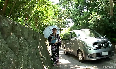 Kimono dame in a van sucks prick and gets toy fucked