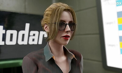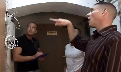 Curvaceous office MILF jerks off stranger's cock in lobby