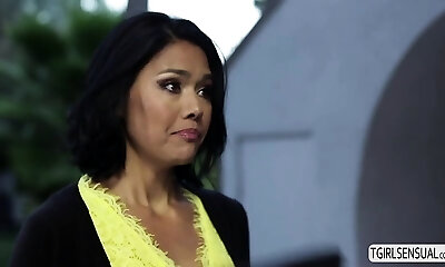 Diminutive Asian tranny slides her aching cock into a guy's asshole