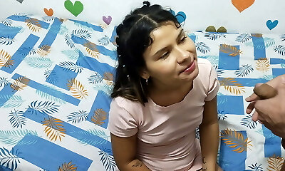 Cute sweet brunette teen flashes her tits and gives dude a lovely blowjob
