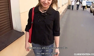 Teen babe got cold without panties on public and went to the guy's palace on the very first appointment